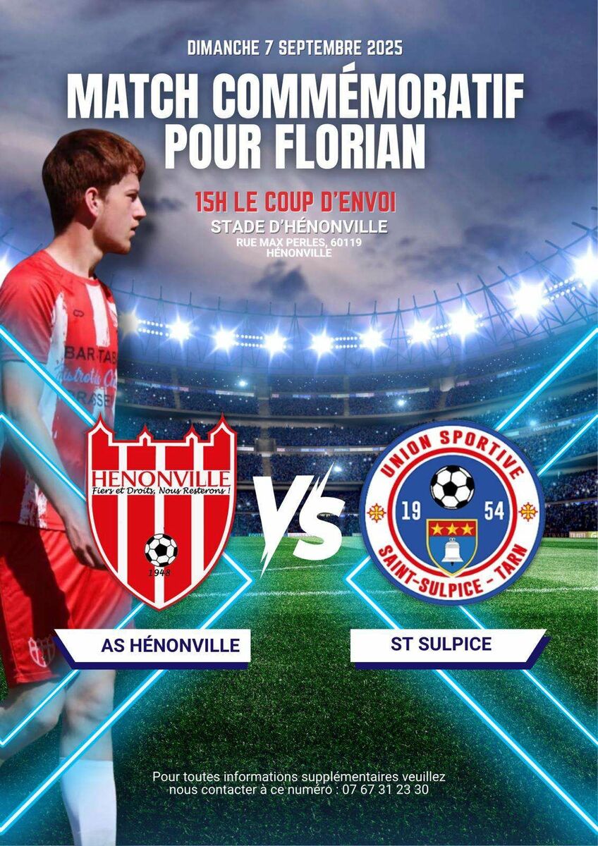 Le dimanche 07/09, à l’occasion de la rencontre contre St Sulpice à 15H, l’AS Hénonville rendra un hommage en mémoire de Florian, un membre cher à notre club, disparu bien trop tôt.